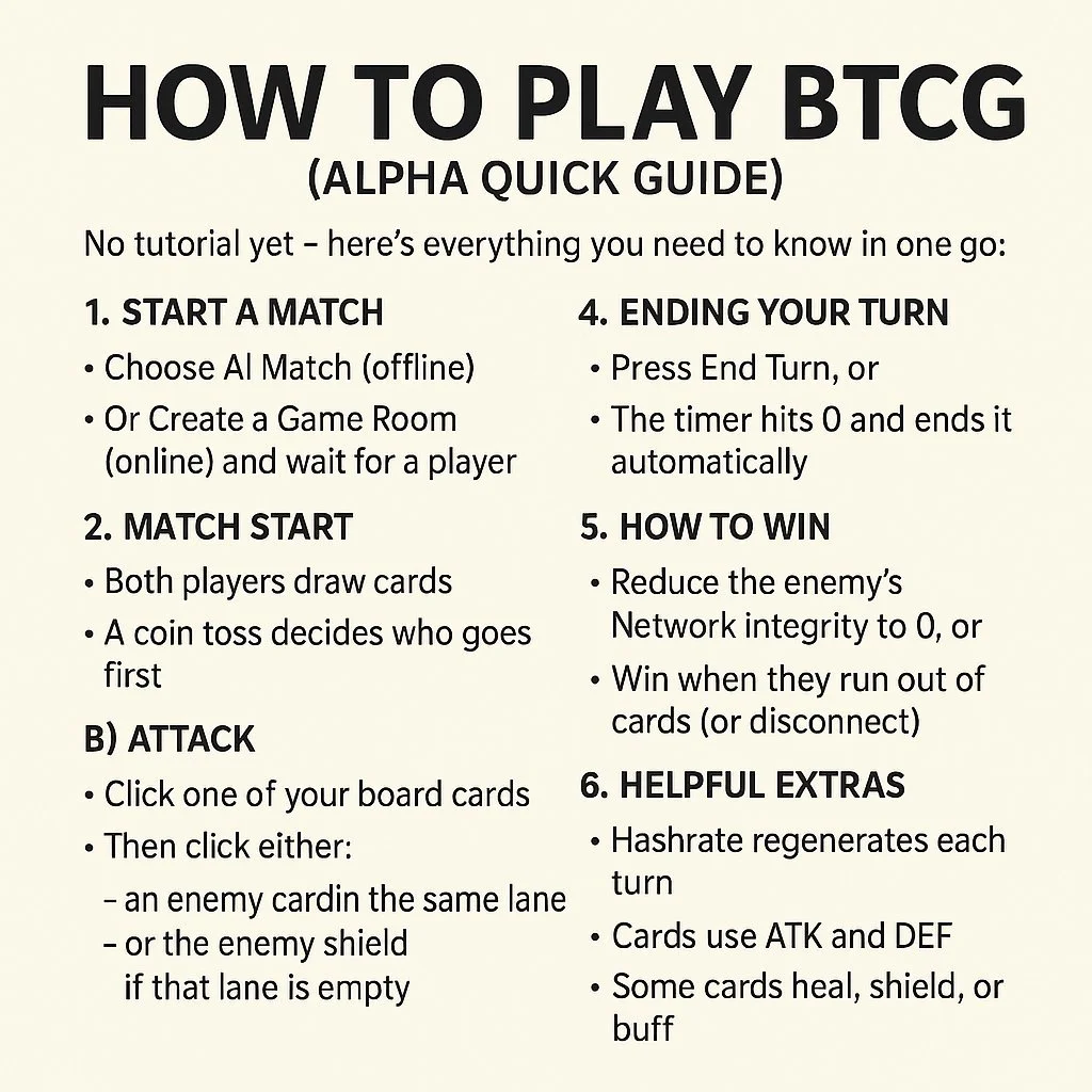 BTCG is a 1v1 online card battler built for Bitcoiners (and anyone curious enough to join the fun). Build your deck, summon Operators, Signals, Protocols, and Artifacts, and battle it out with cards that capture the spirit of Bitcoin.